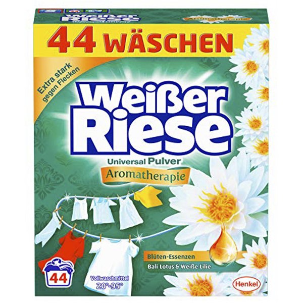 Weisser Riese Lotus a bílá lilie - parfemovaný prací prášek na bílé prádlo - 44 pracích dávek Speciálně parfemovaný prací prášek Weisser Riese Aromatherapie je pro milovníky krásných a jemných vůní květin. Tento prášek je vhodný na univerzální praní bílého a stálobarevného prádla a je inspirován...