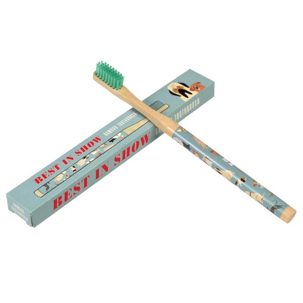 Piękna bambusowa szczoteczka do zębów do codziennego użytku. Szczoteczka ma ładne pudełko prezentowe i jest ozdobiona motywem różnych piesków.