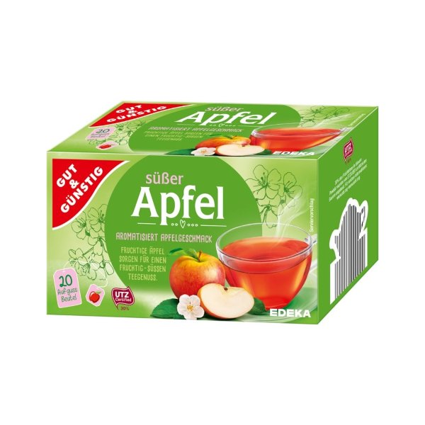 GG Ovocný čaj s příchutí sladkého jablka 20 sáčků, 60gOvocný čaj z 69% jablek zjemněný sladkými ostružinovými listy, pečenými kořínky čekanky a ibiškem. Vyrobeno v NěmeckuZalévejte vždy vařící vodou a nechte louhovat minimálně 5-8 minut.Nutriční hodnoty ve 100ml: Energetická hodnota 12 kJ / 2,9...