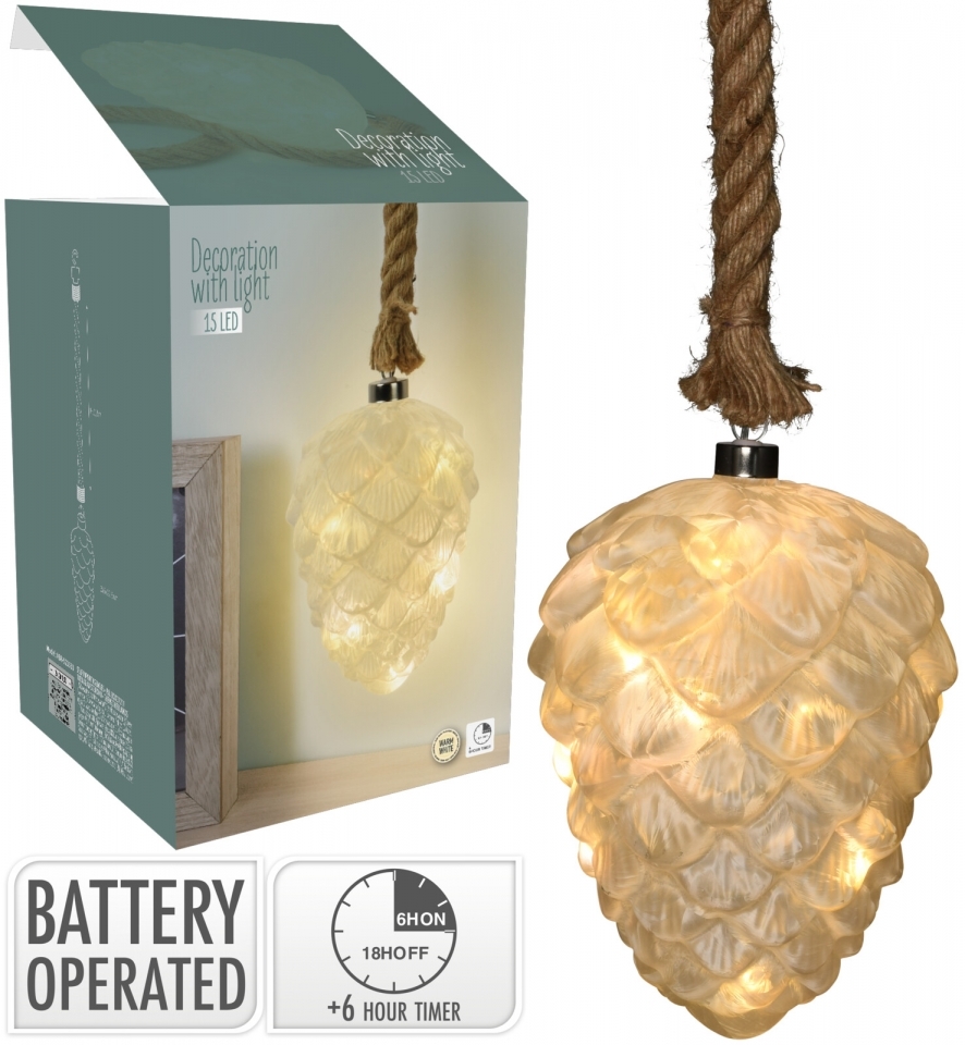 Dekorativní skleněná LED šiška zavěšená na laně. Šišku můžete zavěsit kam se vám zlíbí, nemá žádný přívodový kabel s adaptérem na baterie. V šišce je 15 LED diod s funkcí časovače (6 hodin svítí a 18 hodin nesvítí). Napájení na 2x AA baterie (nejsou součástí výrobku). Pouze pro vnitřní... przeczytaj całość