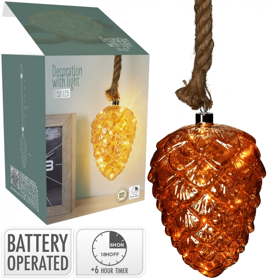 Dekorativní skleněná LED šiška zavěšená na laně. Šišku můžete zavěsit kam se vám zlíbí, nemá žádný přívodový kabel s adaptérem na baterie. V šišce je 10 LED diod s funkcí časovače (6 hodin svítí a 18 hodin nesvítí). Napájení na 2x AA baterie (nejsou součástí výrobku). Pouze pro vnitřní použití.