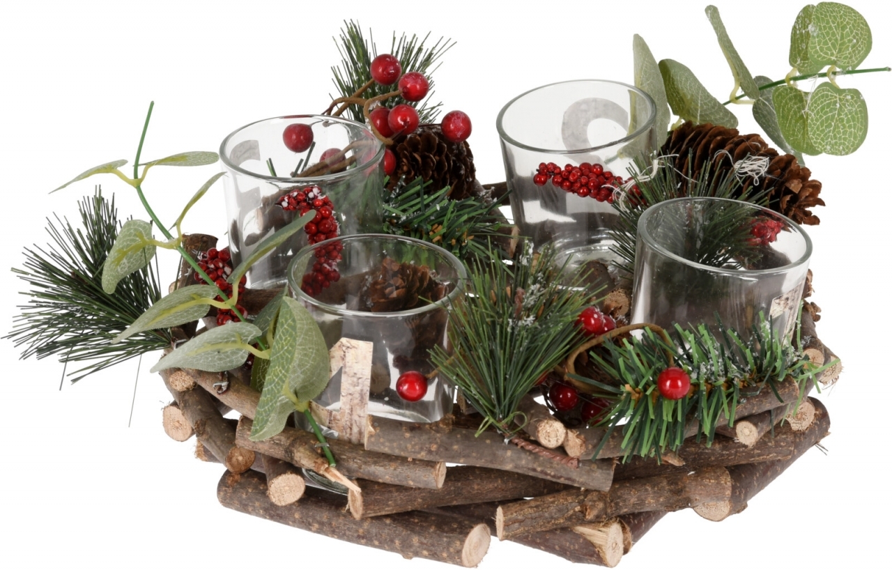Dekorativní dřevěný svícen z dřívek - adventní věnec na 4 svíčky. Svícen je zdobený šiškami, bobulkami, eukalyptem a umělým chvojím borovice a jedle, zasněžený umělým sněhem. Součástí je skleněný kalíšek na svíčku.Materiál: dřevo, plast, skloRozměry:výška 8 cmprůměr 22 cmskleněný kalíšek... przeczytaj całość