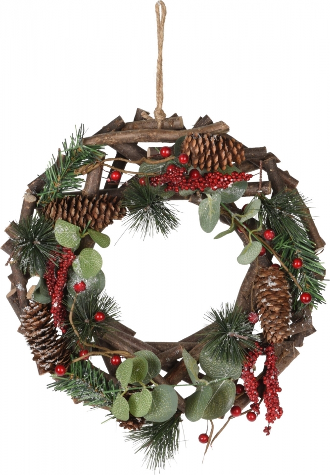 Dekorativní dřevěný věneček na zavěšení z dřívek. Věneček je zdobený šiškami, bobulkami, eukalyptem a umělým chvojím borovice a jedle, zasněžený umělým sněhem.Materiál: dřevo, plastRozměry:tloušťka 8 cmprůměr 30 cm przeczytaj całość