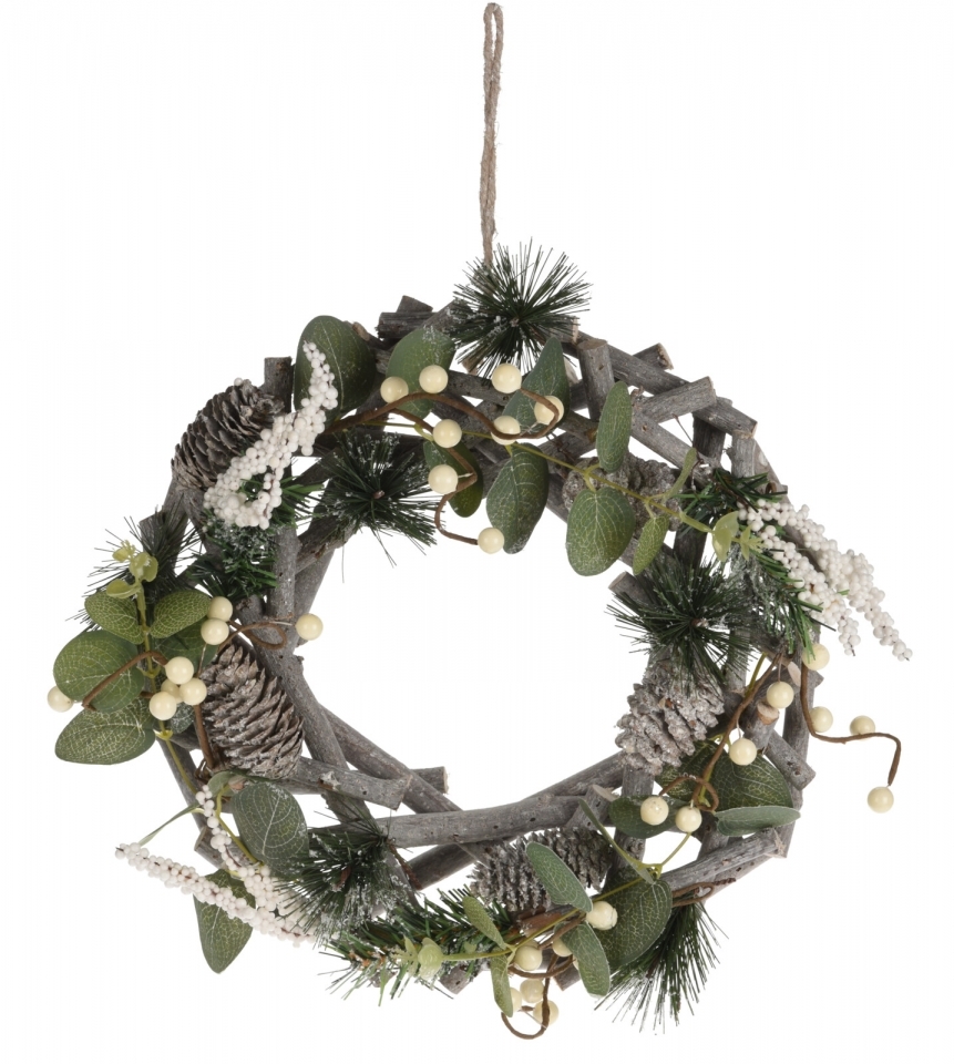 Dekorativní dřevěný věneček na zavěšení z dřívek. Věneček je zdobený šiškami, bobulkami, eukalyptem a umělým chvojím borovice a jedle, zasněžený umělým sněhem.Materiál: dřevo, plastRozměry:tloušťka 8 cmprůměr 30 cm przeczytaj całość