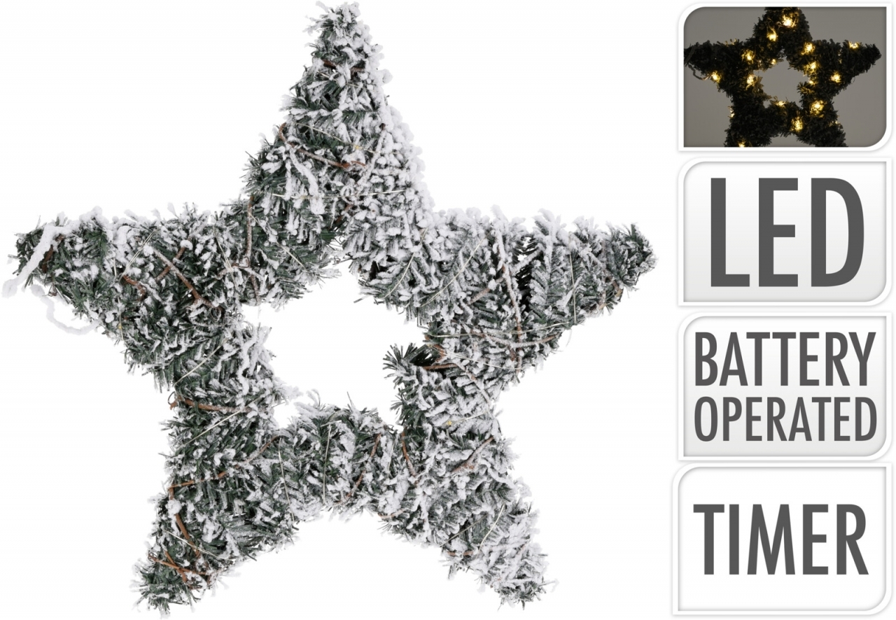 Svítící ratanová hvězda s umělým zasněženým chvojím a 30 LED diodami teplé bílé barvy. Součástí je časovač 6h/18h.Stupeň krytí IP20 - dostatečně chrání proti úrazu elektrickým proudem při nebezpečném dotyku prstem, je odolné proti vniknutí malých cizích předmětů a není chráněno proti vniknutí...