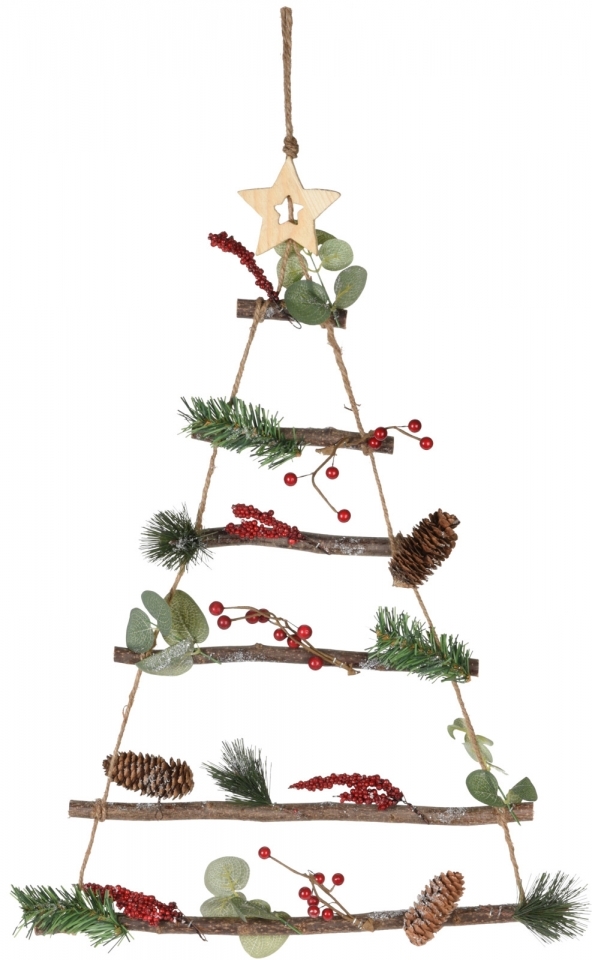 Dekorativní dřevěný stromeček na zavěšení z dřívek. Vánoční stromeček je zdobený šiškami, bobulkami, eukalyptem a umělým chvojím borovice a jedle, zasněžený umělým sněhem.Materiál: dřevo, plastRozměry:délka 70 cmšířka 40 cmhloubka 7 cm przeczytaj całość