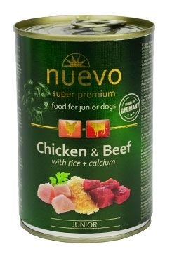 Konserva Nuevo Kurczak i Wołowina jest odpowiednia dla młodych psów i szczeniąt, zawiera mięso z kurczaka i wołowiny. Wysoka zawartość świeżego mięsa dostarcza białka o wysokiej wartości biologicznej. Odpowiedni poziom białka, tłuszczów, minerałów i witamin tworzy zbilansowane, kompletne pożywienie, które pokochają nawet najbardziej wybredne psy! Skład karmy wspiera odporność i sprawność Twojego pieska. Nie zawiera sztucznych barwników, aromatów ani konserwantów.