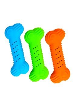 Hračka kost je vyrobená z pevné gumy, při skousnutí vydává praskavý zvuk.Dodává se v mixu tří atraktivních barev (modrá, oranžová a zelená)Rozměr:  55 x 35 x 140 mm  przeczytaj całość