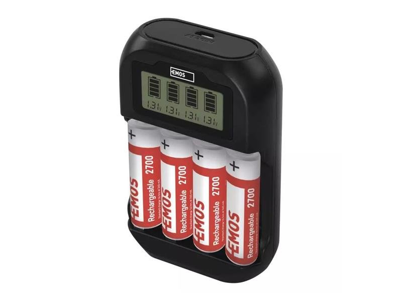 Nabíječka baterií EMOS BCN-41D pro nabíjení článků AAA, AA. K nabíječce jsou přiložené baterie AA NiMH 2700.