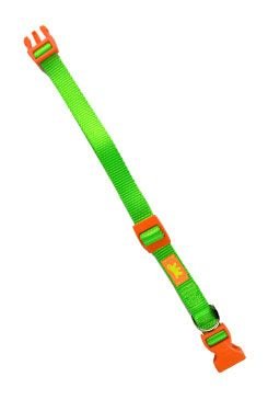 Nylonový obojek světle zelené barvy s oranžovými doplňky. przeczytaj całość