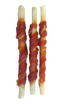 Przysmak prasowany ze skóry, obtoczony suszonym mięsem kaczym.