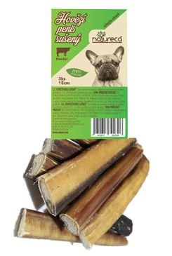 - Zawartość: 3 sztuki suszonego wołowego penisa, długość 15 cm