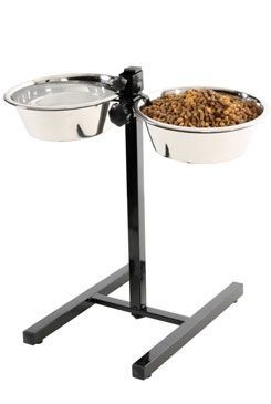Stojan na misky v černé barvě. Dvě misky 2,5l jsou součástí balení.Nastavitelný stojan je vhodný pro velké plemena.Výška stojanu maximálně 46 cm. Výškové umístění misek je nastavitelné.Rozměry: 500 x 267 x 515 mm przeczytaj całość