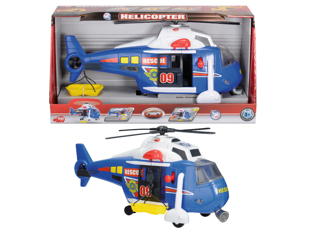 Záchranářský vrtulník se zvukovými a světelnými efekty. Vrtule se točí, lehátko se ovládá tlačítkem (nahoru/dolů). Nechybí otevírací dveře. Velikost 41 cm. przeczytaj całość