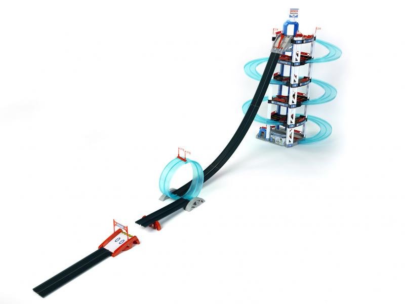 Velká šestipatrová garáž v licenci Bosch. Součástí garáže je dlouhá dráhá z nejvyššího patra, která má uprostřed kruh, kde autíčko může kruhem projet a projede cílem. Součástí je výtah, spousta parkovacích míst, a skvělé dráhy z pater, kde můžou autíčka soutěžit, kdo se dřív dostane dolů.... przeczytaj całość
