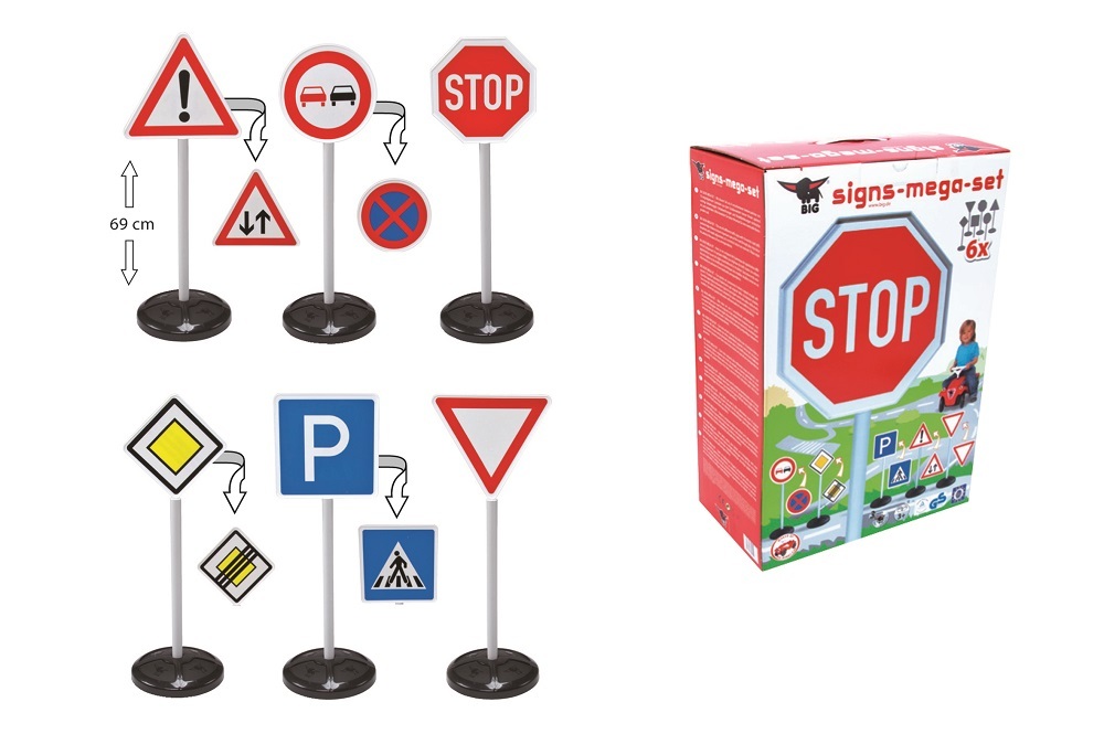 Velká sada 6 dopravních značek. 4 značky mají jiný symbol na přední a zadní straně. Set obsahuje následující značky: stop, pozor jiné nebezpečí, provoz v obou směrech, zákaz předjíždění, hlavní silnice, konec hlavní silnice, zákaz zastavení, parkoviště, přechod pro chodce. Výška 69 cm. przeczytaj całość