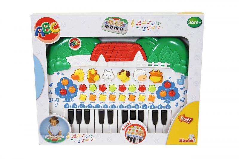 Pianinko ze zwierzątkami z różnymi dźwiękami i funkcjami: 8 instrumentów muzycznych (pianino, skrzypce, trąbka, klarnet, organy, ksylofon, ukulele, dzwonki), 6 odgłosów zwierząt (koń, owieczka, ptaszek, pies, kaczuszka, krówka), 8 melodii, możliwość nagrywania i odtwarzania, przycisk "brawa" i okrzyk "yeh", regulacja głośności, zmiana tempa, funkcja stop, klasyczne klawisze fortepianowe, na których można zagrać gamę lub skalę według zwierzątek, oraz efekty świetlne. Wymiary 28 x 39 cm.