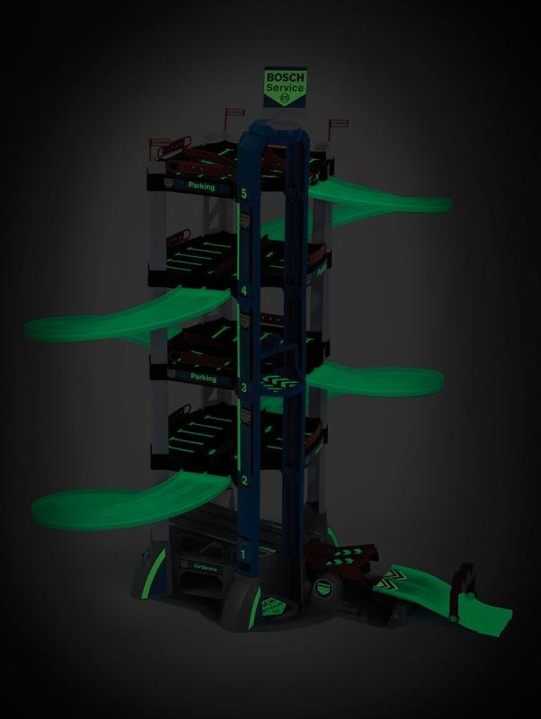 Dětská parkovací garáž v licenci Bosch s 5 patry a dvěmi autíčky a výtahem. Garáž když se nasvítí tak ji za tmy svítí dráhy. Rozměry garáže složené je výška 91cm a šířka 55cm. Doporučený věk 3+ przeczytaj całość