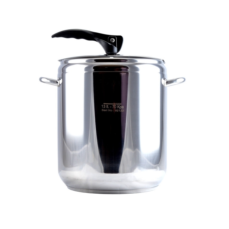 nerezový tlakový hrnec 14 litrů s pákovým uzávěrem průměr 23 cm a výška 31 cm silné sendvičové dno víko obsahuje dva ventily, hlavní pracovní ventil a pomocný / bezpečnostní ventil tlakový hrnec je určen pro rychlou přípravu pokrmů a lze jej používat na všechny typy varných desek vč.indukce hrnec... przeczytaj całość