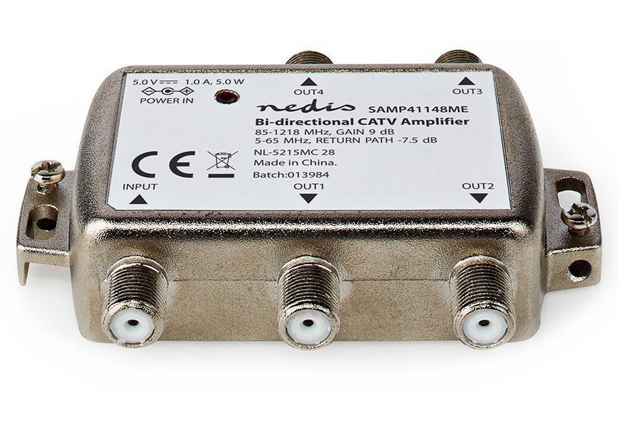 NEDIS zesilovač CATV/ maximální zesílení 9 dB/ 85-1218 MHz/ 4 výstupy/ zpětný kanál - 7,5 dB/ 5-65 MHz/ konektor F/ šedý