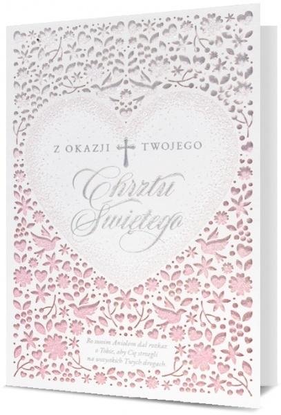 Elegancki karnet B6 z okazji chrzcin. Bogate zdobienia, połyskujące cyrkonie, perłowa folia oraz brokat. Wewnątrz karnetu życzenia oraz elegancka koperta. Format: 19.5x13 cm. przeczytaj całość