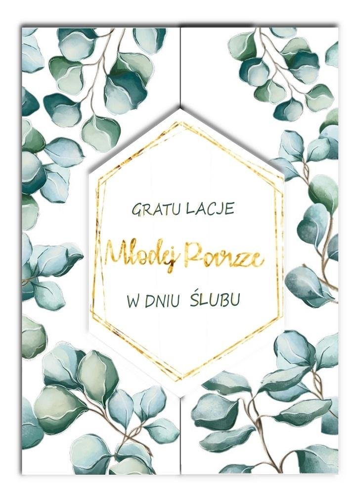 Karnet rozkładany w formacie A5. Złocony , teksy życzeń w środku. Wydrukowany na wysokiej jakości papierze. W zestawie bilecik do prezentu oraz koperta. przeczytaj całość