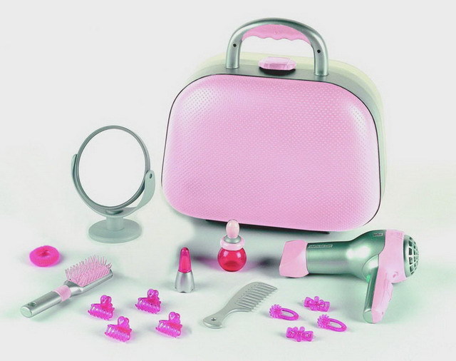 Kuferek fryzjerski Braun zawiera w pełni funkcjonalną suszarkę do włosów, szczotkę do włosów, grzebień, lusterko, wsuwki do włosów oraz szereg innych akcesoriów. Wszystko jest ułożone w praktycznym przenośnym plastikowym kuferku. Suszarka zasilana jest bateriami typu AA (1 x 1,5 V R6), które nie są dołączone. Materiał: plastik. Właściwe dla dzieci od 3 lat.