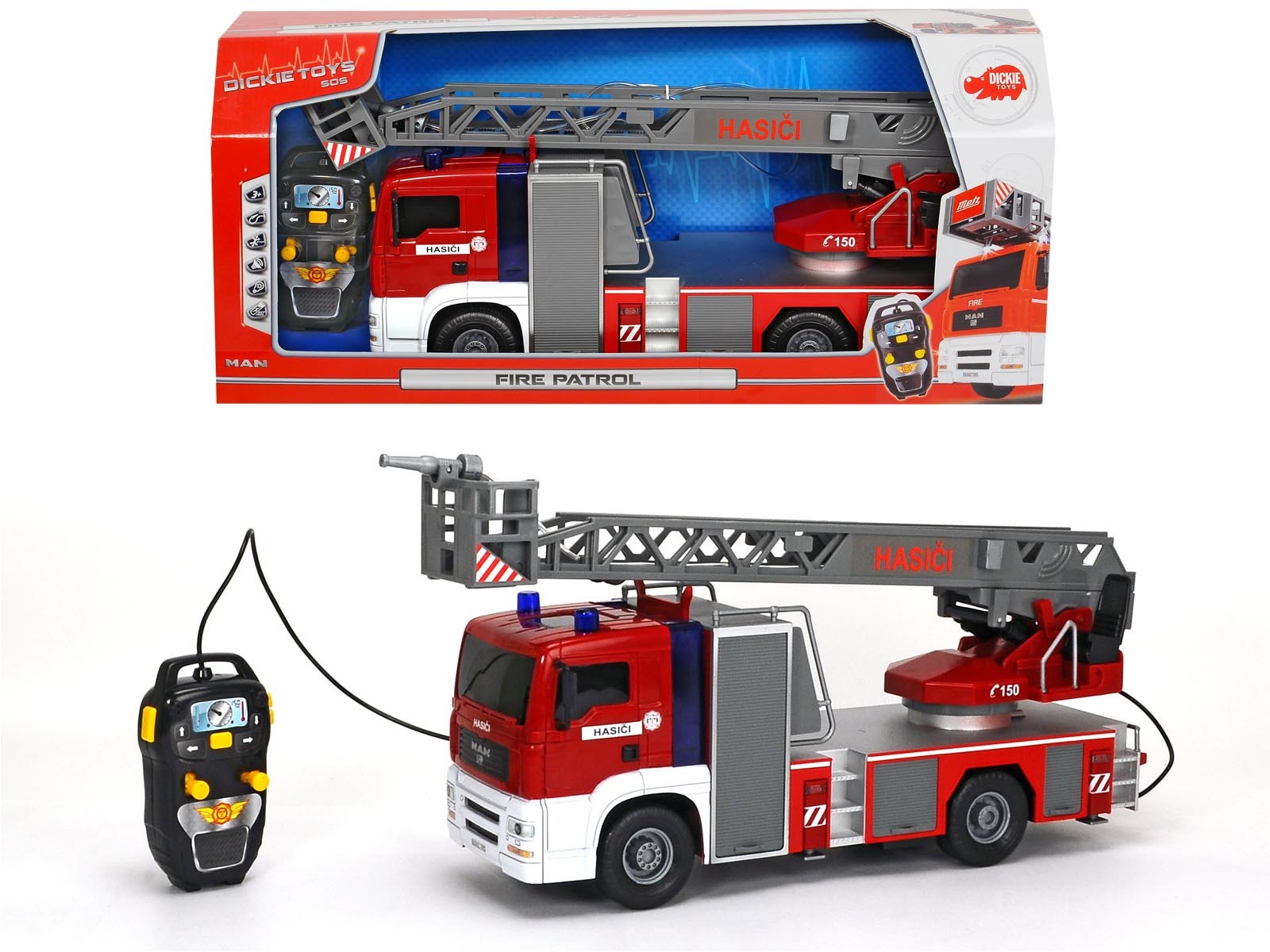 Hasičské auto MAN na dálkové, kabelová ovládání v české verzi. Světelný a zvukový efekt. Funkční hadice na stříkání vody pomocí dálkového ovládání. Výsuvný žebřík se ovládá manuálně. Délka auta 50 cm. przeczytaj całość