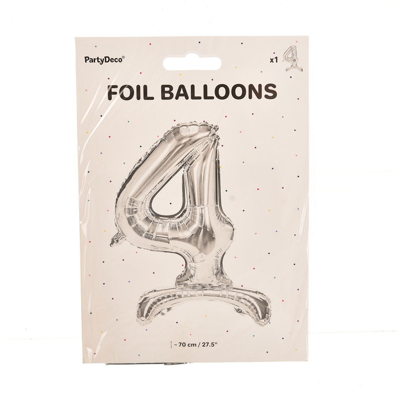 Balon foliowy cyfra 4 srebrny stojący 70 cm Uwaga: nie napełniać helem - tylko powietrzem! Balon z podstawką napełnia się wyłącznie powietrzem i dzięki podstawce można go łatwo postawić na stole. Dekorację można uzupełnić innymi elementami w srebrnym kolorze. Balony foliowe oferujemy w różnych kształtach i kolorach. Są co prawda droższe niż klasyczne balony lateksowe, ale ich zaletą jest jakość i szczelność. Balony foliowe nadmuchane powietrzem wytrzymają kilka miesięcy bez większych zmian. Balon ma samozamykający się zawór, który zaraz po nadmuchaniu zapobiega ucieczce powietrza. Przy napełnianiu powietrzem prosimy używać pompki ręcznej lub słomki do picia. Inspirację do dekoracji znajdziesz na internetowym magazynie www.party-narozeniny.cz POZOR!!! Wszystkie oferowane przez nas balony foliowe mają samozamykający się zawór. W przypadku napełniania powietrzem używaj pompki ręcznej. Po nadmuchaniu balony zamykają się same. Można je też ewentualnie dopompowywać przez zamykany zawór.