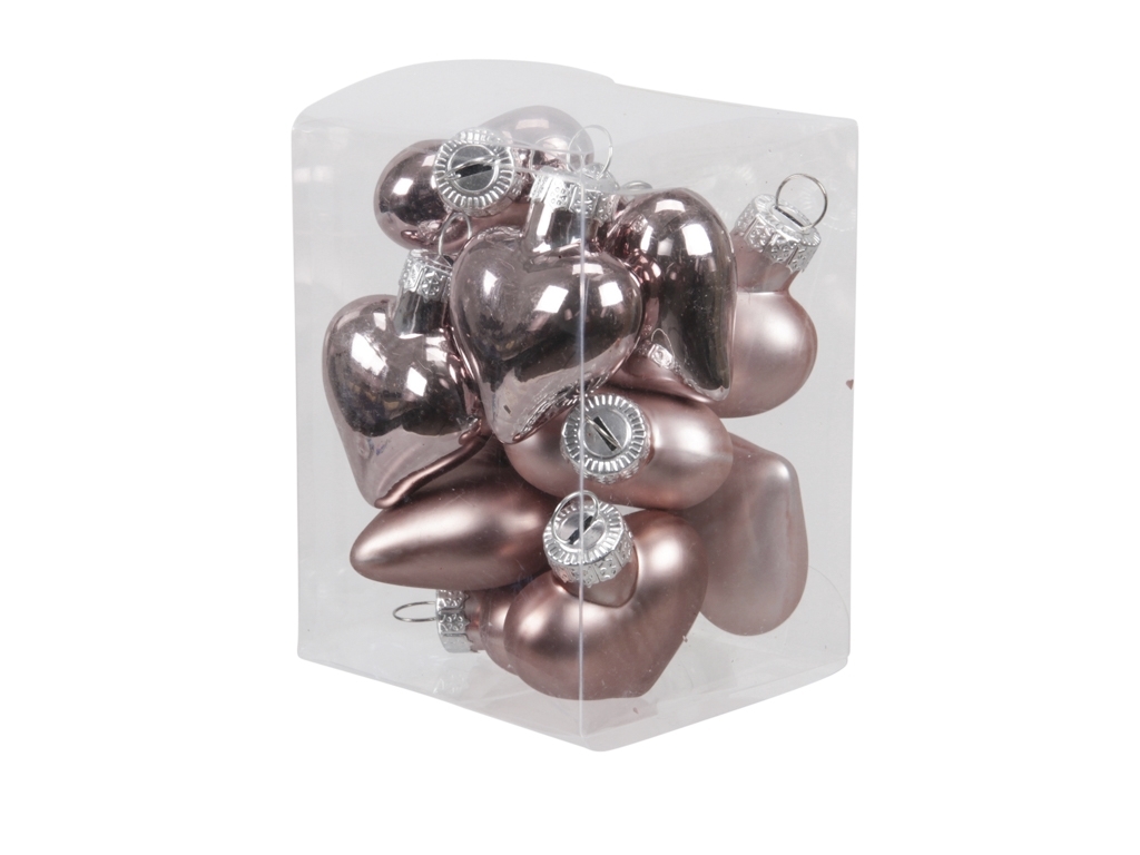 Sada 12 ks skleněných baněk  - srdíček, růžové-kouřové barvy. V sadě jsou namíchané matné a lesklé baňky.Materiál: skloRozměr:4 cm przeczytaj całość