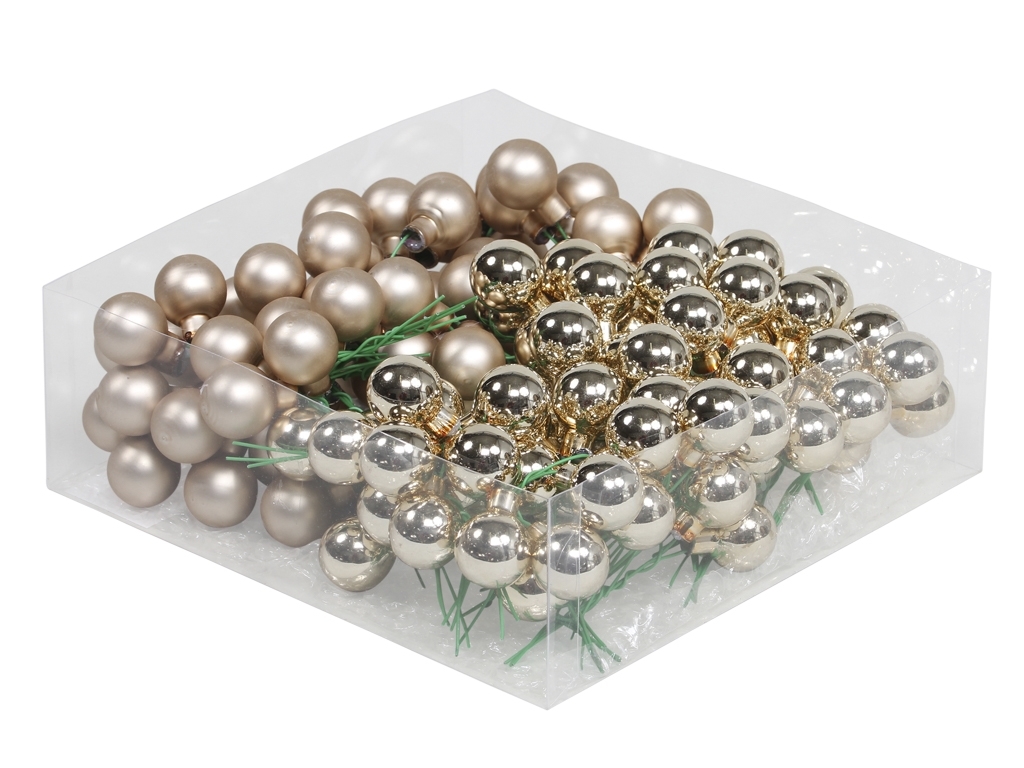 Sada 144 ks skleněných baněk s drátkem v barvě autumn blonde. V sadě jsou namíchané lesklé a matné baňky.Materiál: skloRozměr:průměr 2 cm przeczytaj całość
