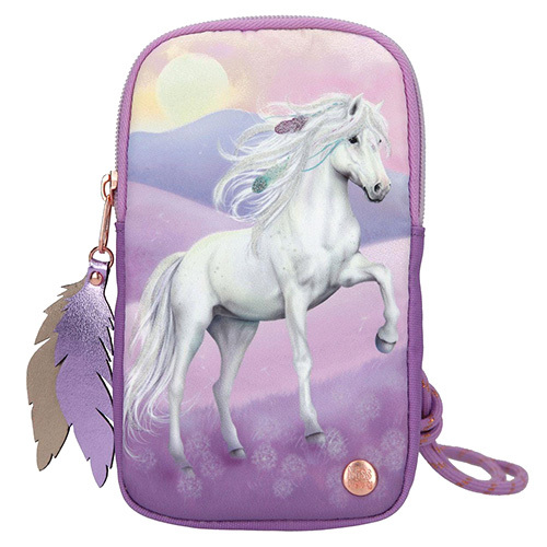 Kapsa na telefon Miss Melody, Fialová s Miss Melody, pastelovou krajinou a pírky | 0411906_A | 20 x 12 x 2 cm