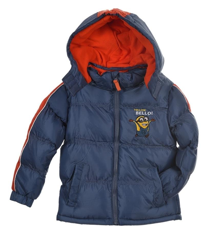 Zimní bunda Mimoni. Tm. modré provedení. S teplou vatelínovou výplní. Uvnitř polyesterová podšívka. Odepínací kapuce na zip, s flísovou podšívkou. 100% polyester. Oficiální licence, Sun City, Francie. przeczytaj całość