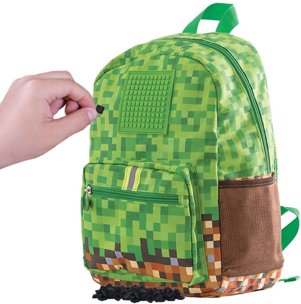 - jedna główna i jedna mniejsza kieszeń - atrakcyjny wzór zielono-brązowej kostki nawiązującej do światowej gry komputerowej - zapięcie na zamki z dużymi uchwytami, które umożliwiają dzieciom łatwe otwieranie i zamykanie plecaka - popularny silikonowy panel umieszczony na przedniej stronie plecaka - dwie boczne siateczkowe kieszenie z elastyczną listwą u górnej krawędzi - regulowane długościowo wyściełane szelki na ramiona z klamrą piersiową, aby paski nie zsuwały się z ramion - przyjemnie wyściełana tylna część plecaka - dla większego bezpieczeństwa plecak wyposażony jest w elementy odblaskowe - gratis: w zestawie 55 małych kolorowych pixeli (pikseli), 10 małych pixeli z literami i 4 multipiksele (piksel o rozmiarze 2x2) z obrazkami