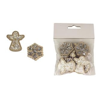 Sada dekoračních přízdob.Sada obsahuje 12 přízdob.Rozměry : 3,5 - 3,7 x 0,5 cm, výška 4 cm .Barva : kombinace přírodní. bílá, stříbrná.Materiál na bázi dřeva. przeczytaj całość