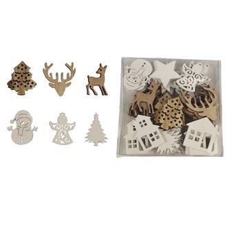 Sada dekoračních přízdob.Sada obsahuje 72 přízdob.Rozměry : 2,5 - 3 x 0,2 cm, výška 3 - 3,8 cm.Barva : kombinace bílá, přírodní.Materiál na bázi dřeva. przeczytaj całość