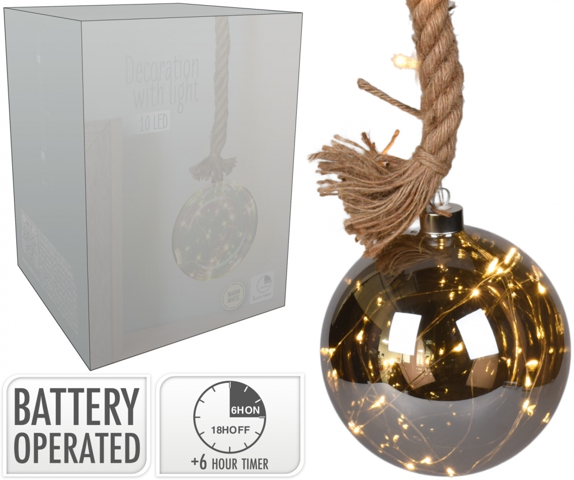 Dekorativní skleněná LED koule zavěšená na laně s LED diodami. Kouli můžete zavěsit kam se vám zlíbí. V baňce je 15 LED diod s funkcí časovače (6 hodin svítí a 18 hodin nesvítí) a na laně 9 LED diod. Napájení na 2x AA baterie (nejsou součástí výrobku). Pouze pro vnitřní použití.Materiál: sklo,... przeczytaj całość