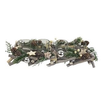 Dekorační adventní svícen.Rozměry : 36 x 13 cm, výška 8 cm.Barva : kombinace přírodní, zelená, bílá.Materiál : přírodní, plast, sklo. przeczytaj całość