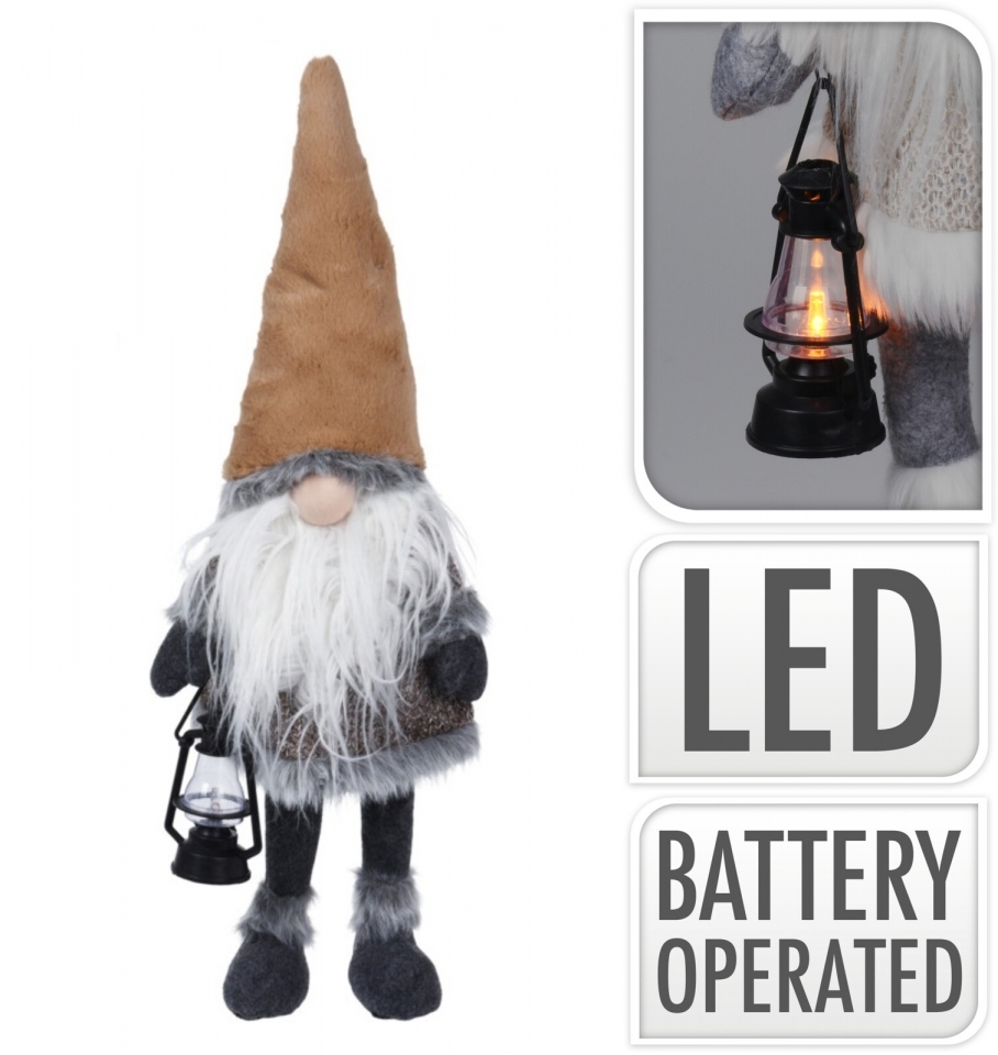 Veselý skřítek s douhými vousy a vysokým čepcem přináší štěstí celé rodině. Vánoční skřítek je strážce dobré nálady a chrání členy domácnosti. Skřítek má svítící nos - 1x LED dioda napájená 3x AG13 baterií (součástí výrobku) a problikávajíví lucerničku (imitace svíčky) napájená 1x CR2032 baterií.