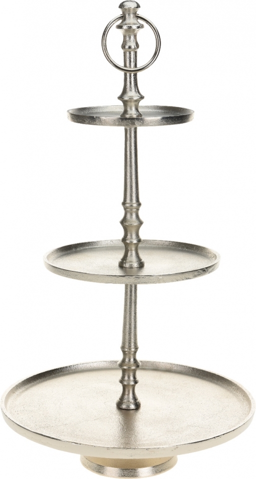 Třípatrový hliníkový etažér. Etažér není vhodný k přímému kontaktu s potravinami.Materiál: hliníkRozměry:výška 49 cmprůměr malého talíře 13 cmprůměr středního talíře 18 cmprůměr velkého talíře 27 cmHmotnost: 1550 g przeczytaj całość