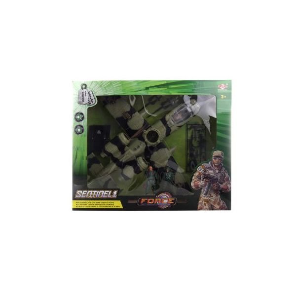 Vojenská sada s velkým letadlem. Letadlo svítí a vydává zvuky. Napájení na 2 AA baterie (nejsou součástí). Součástí balení jsou také 2 vojáčci a zbraně. Rozměry balení cca 50,5 x 42 x 14 cm. Věk 3+ przeczytaj całość