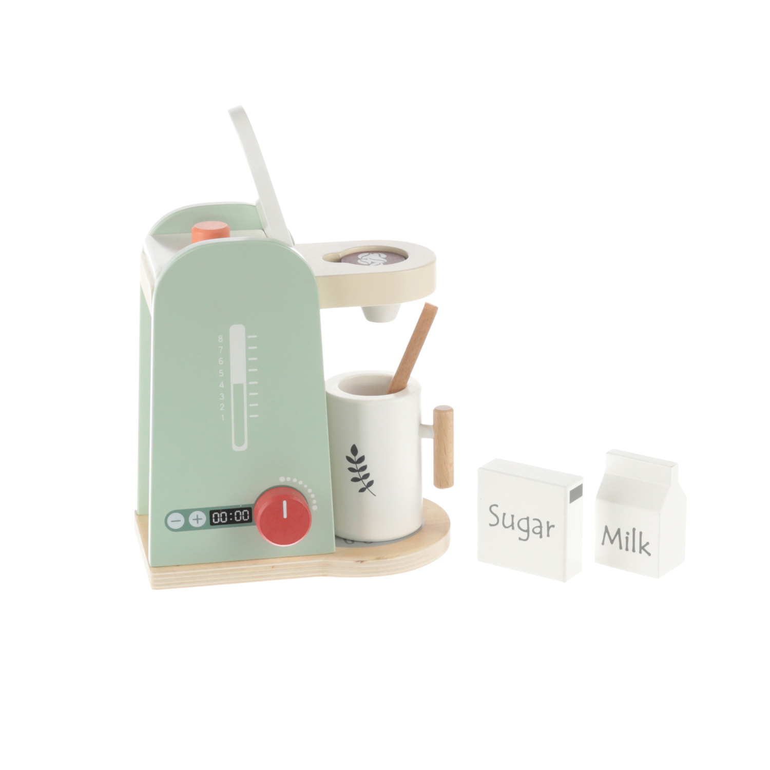 W zestawie jest duża drewniana filiżanka z łyżeczką oraz składniki do przygotowania kawy. Zabawka