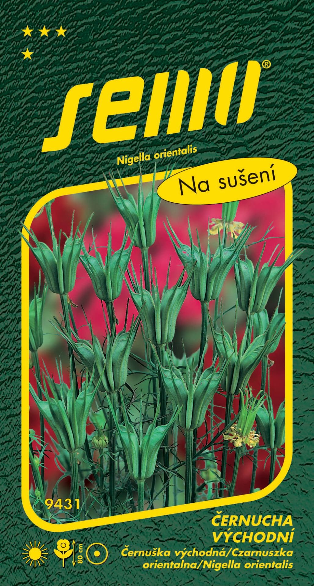 Nigella orientalis L. / Černuška východná Popis:Netradiční černucha pěstovaná pro efektní tobolky vykrajovaného tvaru. Má vzpřímený habitus a pevné stonky. Je velmi vhodná k sušení. Pěstování je podobné jako u černuchy damašské. Přímý výsev: březen - duben do řádků 10 - 40 cm, možný podzimní...