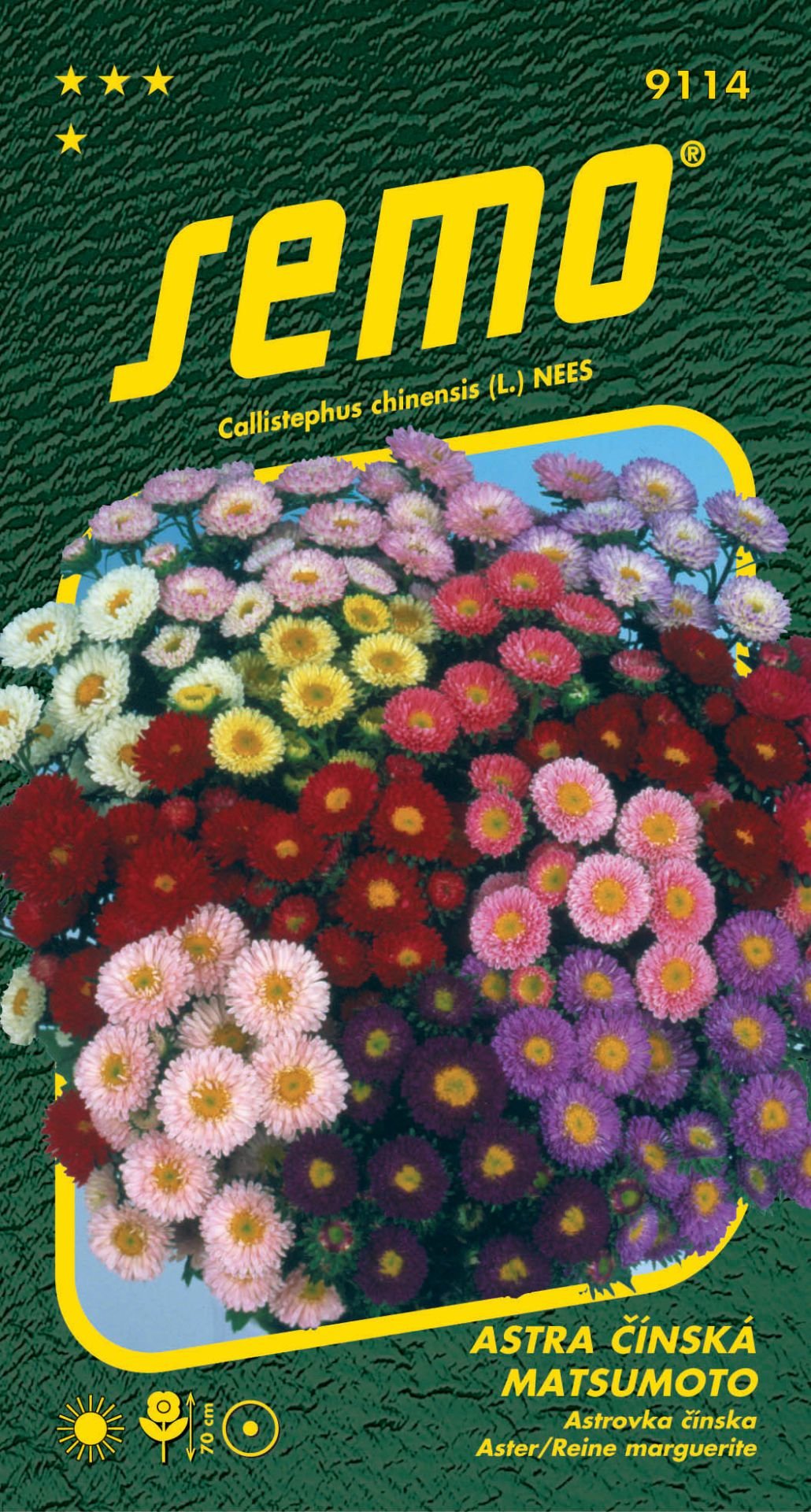 Callistephus chinensis ( L.) NEES / Astrovka čínskaODRŮDA: Astra čínská - Matsumoto směs 0,3g (kód 9114)Popis:Vzpřímeně rostoucí větvená letnička určená zejména k řezu a k záhonovým výsadbám. Listy jsou vejčité, zubaté. Vyžaduje slunné stanoviště. Nedoporučujeme přímé organické hnojení....