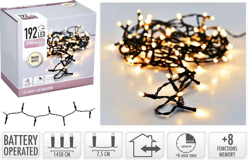 Vánoční LED světelný řetěz pro použití uvnitř i venkucelkem 192 LED žárovek v barvě teplá bílávykouzlí úžasnou atmosféru kdekoliv jej rozvěsíte, ať už na vašem domě, na stromečku, na zahradě, terase, balkóně nebo i uvnitř domumůžete libovolně přepínat mezi 8 různými světelnými efektynastavitelný...