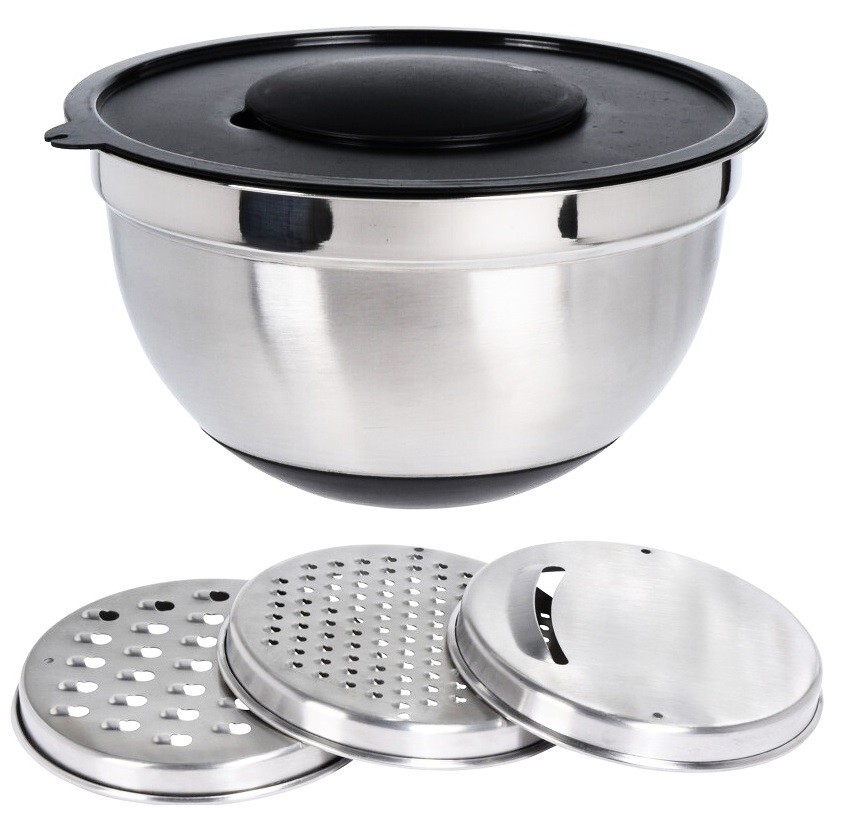 MIXING BOWL SET, STAINLESS STEEL. BOWL DIA 255XH140MM, 355 GRAM WITH RUBBERIZED BOTTOM IN BLACK COLOUR. PP LID 255MM IN BLACK COLOR. 3 DIFFERENT STAINLESS STEEL GRATERS, 115MM, 50 GRAM EACH, TOTAL SET 655 GRAM. EACH IN OUR DESIGN COLOUR BOX/ 270X155X270MM, Colour Box: 1 X pcs Bowl, Stainless...