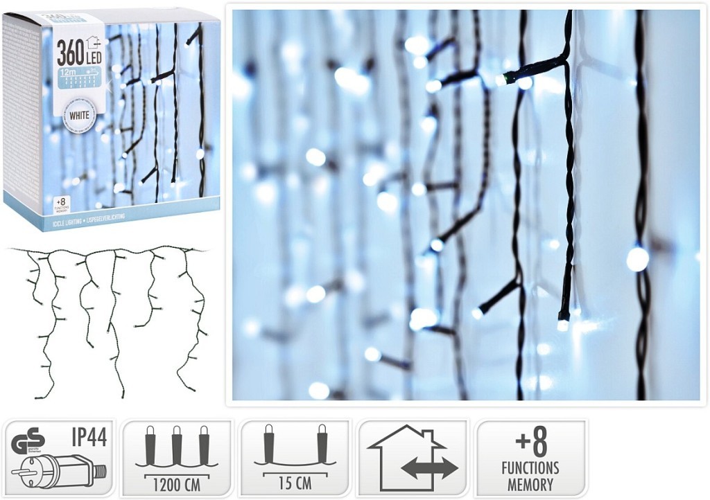 venkovní LED světelný řetěz se světelnými efektycelkem 360 kusů LED žárovek ve studené bílé barvěvykouzlí úžasnou atmosféru kdekoliv jej rozvěsíte, ať už na vašem domě, na zahradě, terase, balkóně nebo i uvnitř domumůžete libovolně přepínat mezi 8 různými světelnými efektynezbytná vánoční...