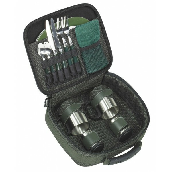 Jedná se o dvoudílnou jídelní sadu, kde má vše své místo. Sada obsahuje 2 hrníčky, 2 talíře, 2 nože, 2 vidličky a 2 kávové lžičky, vše v nerezovém provedení. Sada obsahuje ručník a 2 nádoby třeba na sůl a pepř. Vše je v pevném, kvalitním pouzdru vyrobeném z voděodolného polyesteru 600D. Přepravní rozměry jsou 33 x 27 x 12 cm.