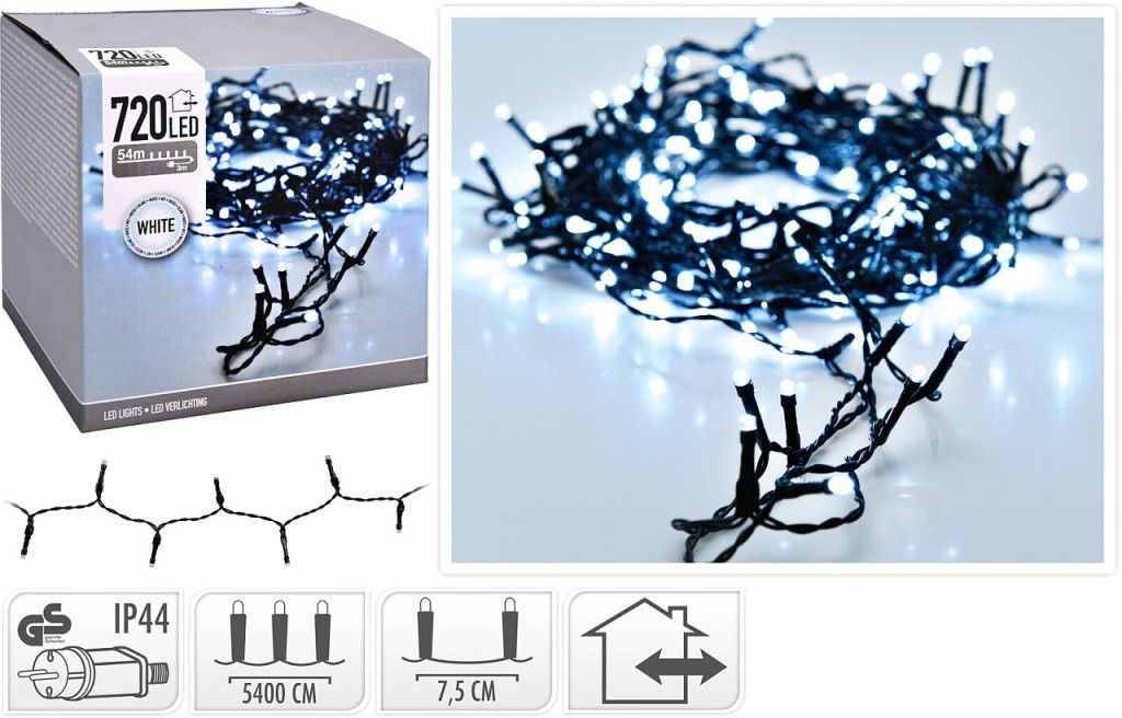 Vánoční LED světelný řetěz pro použití uvnitř i venkucelkem 720 LED žárovek v barvě studená bílávykouzlí úžasnou atmosféru kdekoliv jej rozvěsíte, ať už na vašem domě, na stromečku, na zahradě, terase, balkóně nebo i uvnitř domunezbytná vánoční dekoracevenkovní ochrana IP44, můžete využívat venku...