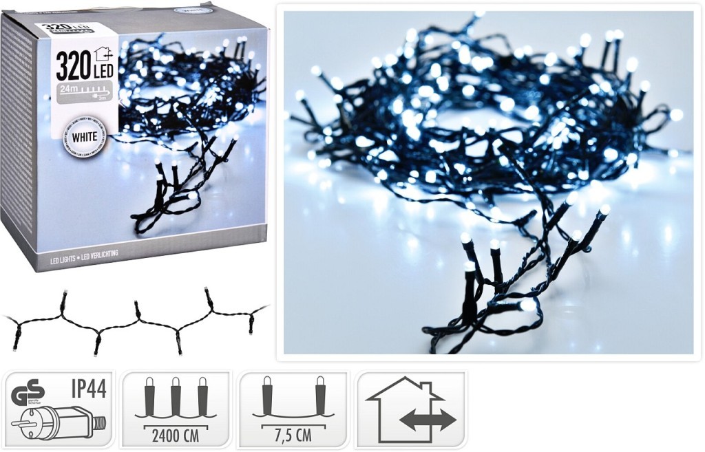 Vánoční LED světelný řetěz pro použití uvnitř i venkucelkem 320 LED žárovek v barvě studená bílávykouzlí úžasnou atmosféru kdekoliv jej rozvěsíte, ať už na vašem domě, na stromečku, na zahradě, terase, balkóně nebo i uvnitř domunezbytná vánoční dekoracevenkovní ochrana IP44, můžete využívat venku...